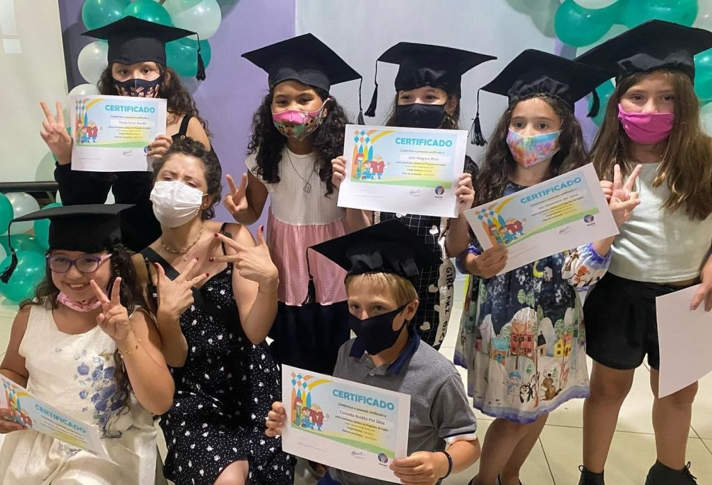 E, então, chegou dezembro, marcado pelas atividades de encerramento do ano letivo: do workshop online para revisão de conteúdo a partir do nível básico às provas finais e, finalmente, à festa de formatura. Nesse evento, a escola, como de costume, prestou sua homenagem aos alunos que concluíram uma etapa de seus estudos de inglês ou espanhol. Esses alunos, por sua vez, tiveram a oportunidade de demonstrar um pouco do que aprenderam até ali com apresentações de vários tipos.